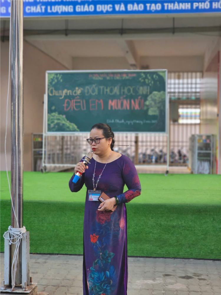 Tiếp theo là khai mạc buổi sinh hoạt về chuyên đề "Đối thoại học sinh - Điều em muốn nói", để khởi động cho chương trình, cô Phạm Thị Ngọc Thủy - Bí thư Chi bộ - Hiệu trưởng nhà trường có đôi lời nhận xét về tình hình nề nếp của trường trong tuần qua.