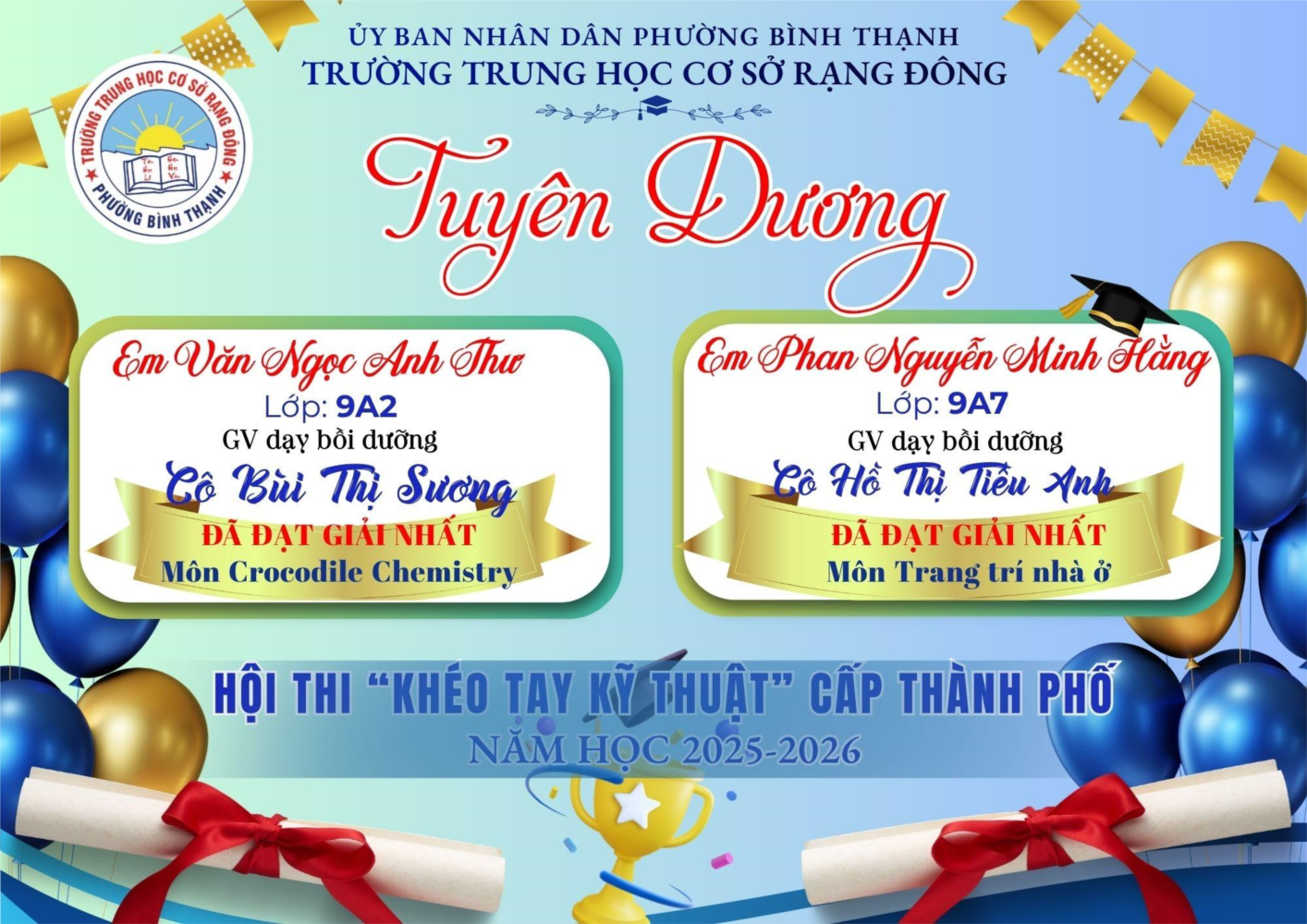 Xin chúc mừng em Văn Ngọc Anh Thư - 9A2 và em Phan Nguyễn Minh Hằng - 9A7 đều đã đạt giải Nhất trong hội thi Khéo tay kỹ thuật cấp Thành phố năm học 2025 - 2026. Nhà trường xin ghi nhận và chân thành cảm ơn sự tận tâm bồi dưỡng của cô Hồ Thị Tiểu Anh và cô Bùi Thị Sương.