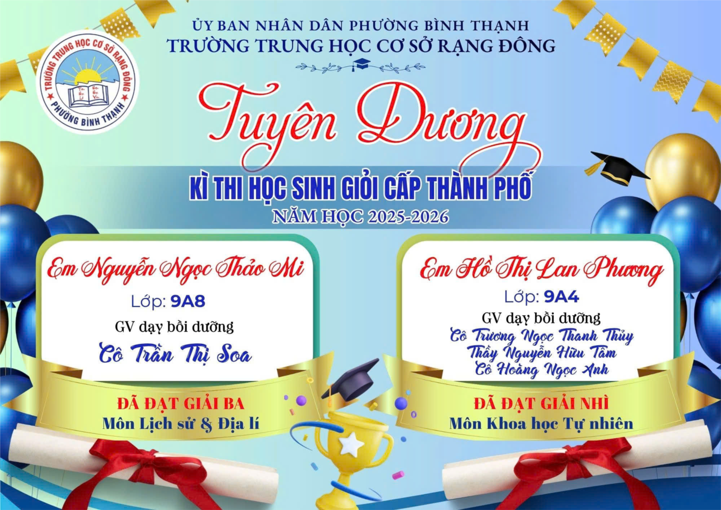 Xin chúc mừng em Hồ Thị Lan Phương - 9A4 đạt giải Nhì môn KHTN và em Nguyễn Ngọc Thảo Mi đạt giải Ba môn LSĐL trong kì thi học sinh giỏi cấp Thành phố năm học 2025 - 2026. Nhà trường xin ghi nhận và chân thành cảm ơn sự tận tâm bồi dưỡng của quý thầy cô trong đội tuyển HSG cấp Thành phố